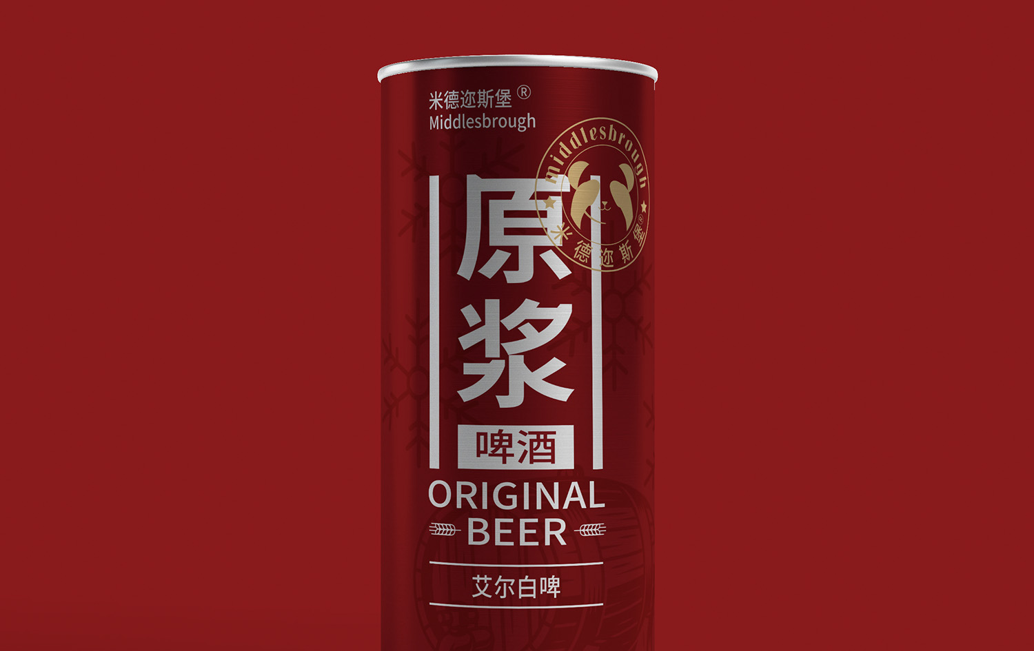 青岛米德迩斯堡出品的原浆啤酒艾尔白啤,包装的设计直接运用文字编辑,展现原浆啤酒特色,使视觉识别力更强。设计字体层次,呈现出力量感,产品与设计统一,建立自己的视觉语言,更具特色,引起消费者青睐